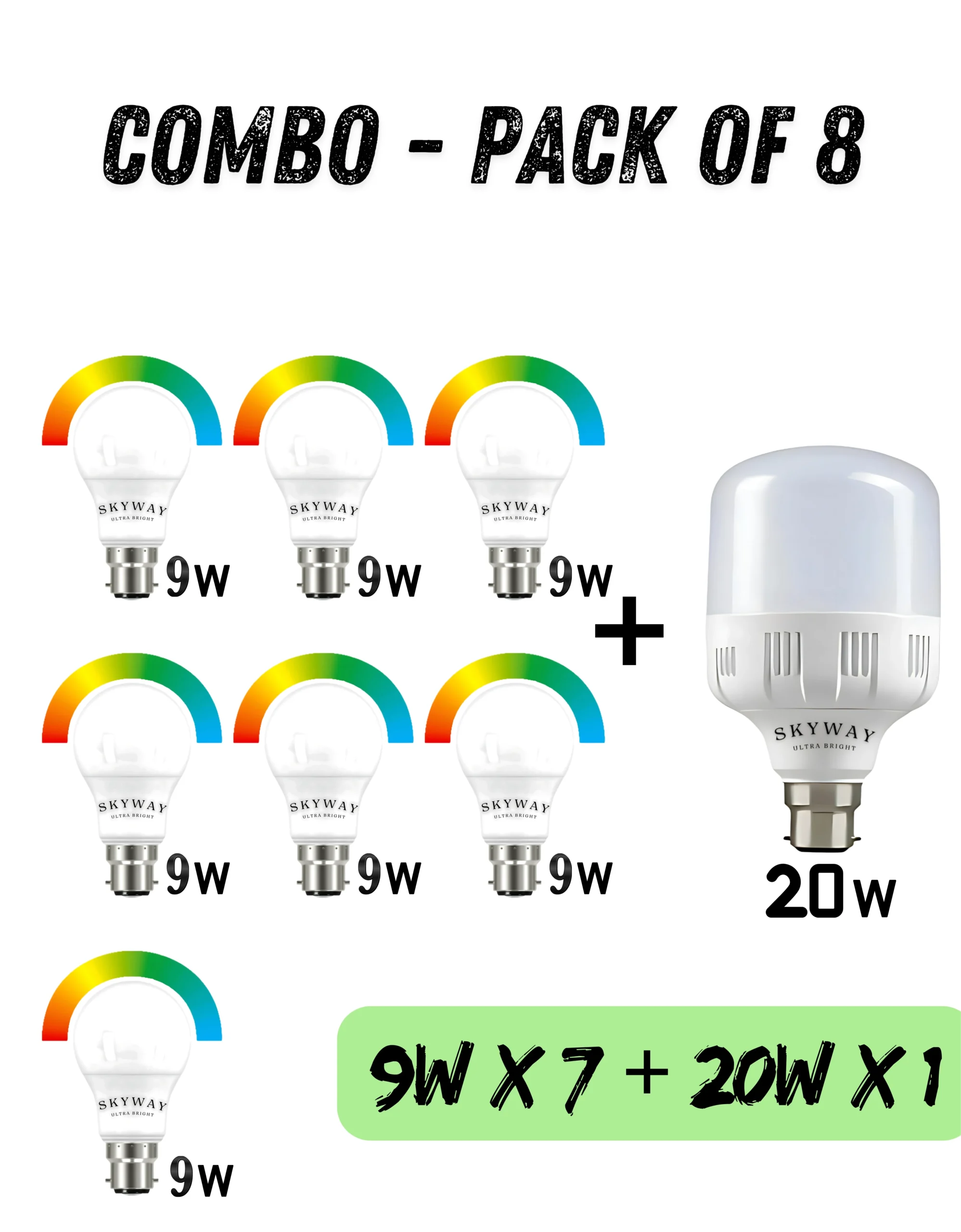 This set offers 7 high-efficiency 9W LED bulbs ideal for regular rooms, plus a 20W Hybrid Dome Style bulb, perfect for halls, lobbies, shops, or larger areas.